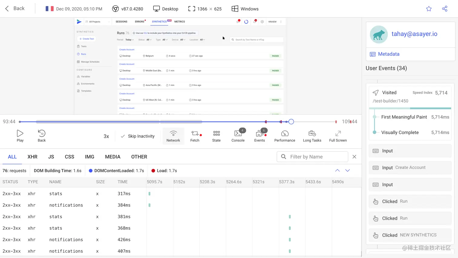 OpenReplay 通过重现问题,就像它们发生在您自己的浏览器中一样,有助于快速找到根本原因。它还通过捕获页面加载时间、内存消耗和慢速网络请求等关键指标来监控您的前端性能。
