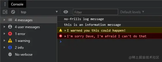 但它不是唯一的类型。消息可以归类为information(其处理方式与 console.log()相同):