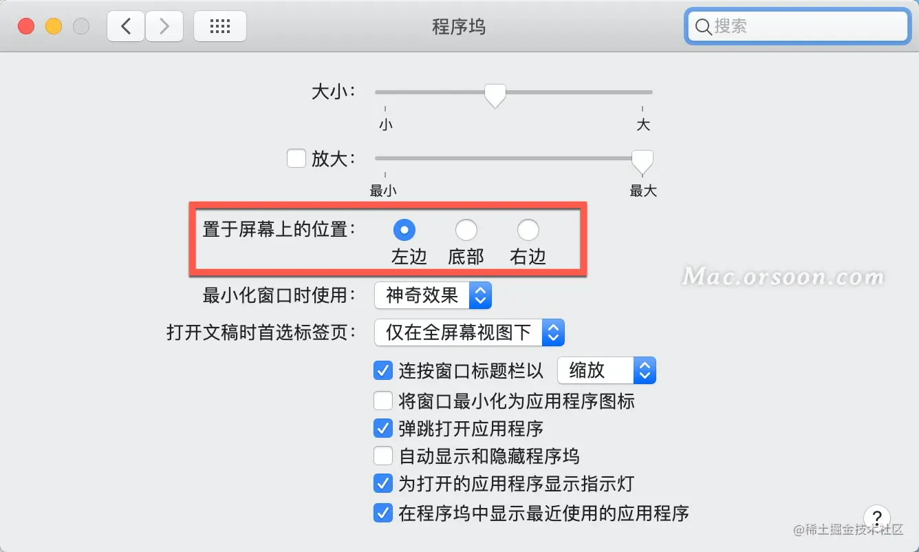 2.在屏幕上找到”置于屏幕上的位置“选项并将其设置为左边或右边。这会将 Dock 锁定到一个屏幕。