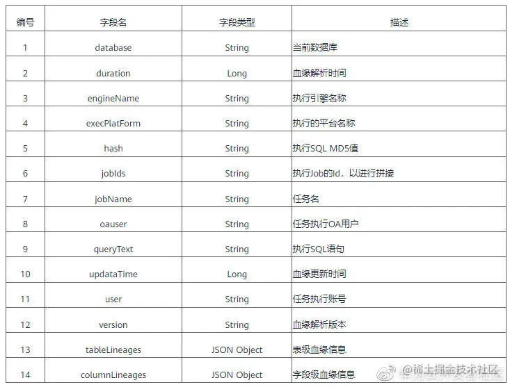 为了便于数据血缘的采集和处理,统一了各个组件的血缘格式,主要包含输入输出表、字段等信息。