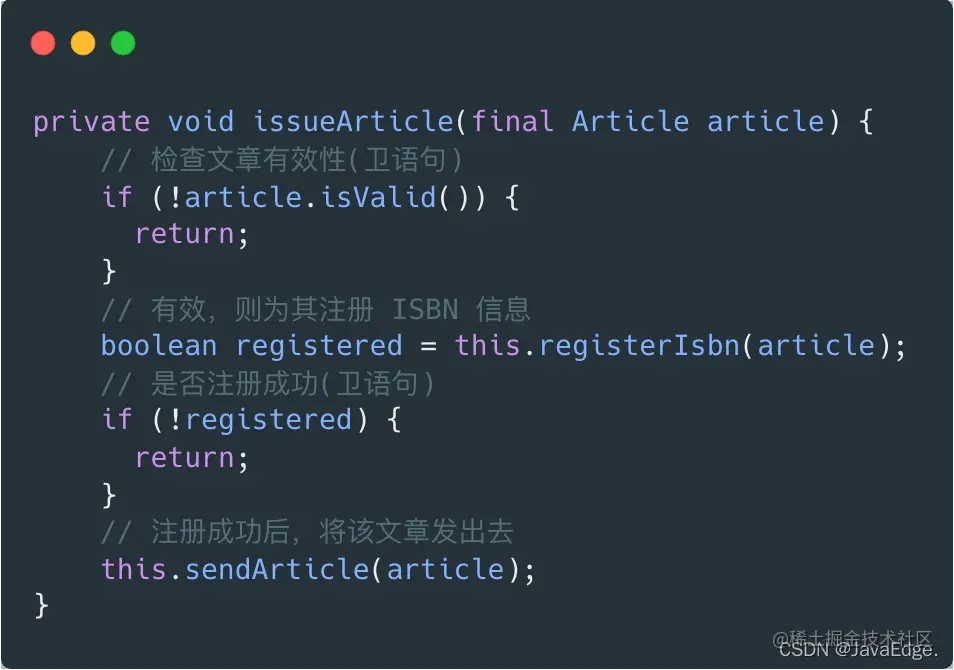 这样的代码可使用卫语句(guard clause),即设置单独检查条件,不满足该检查条件时,方法立刻返回。
