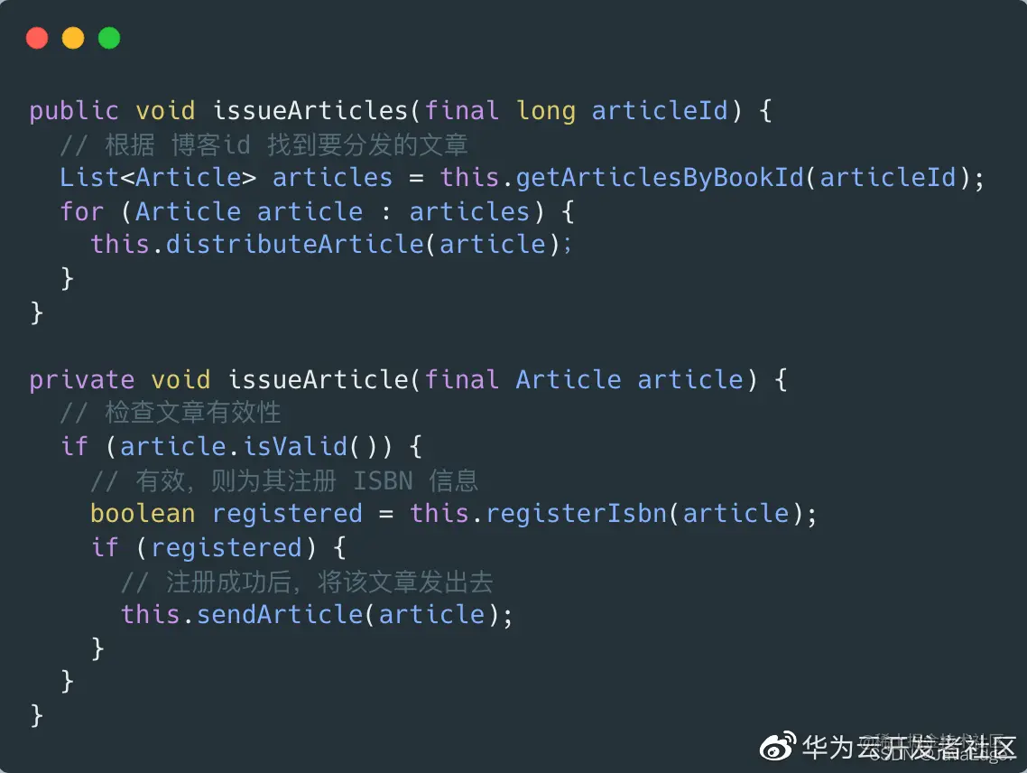 这就是一次拆分,分解出来事务 issueArticle 每次只处理一个元素。这就优化了缩进问题:
