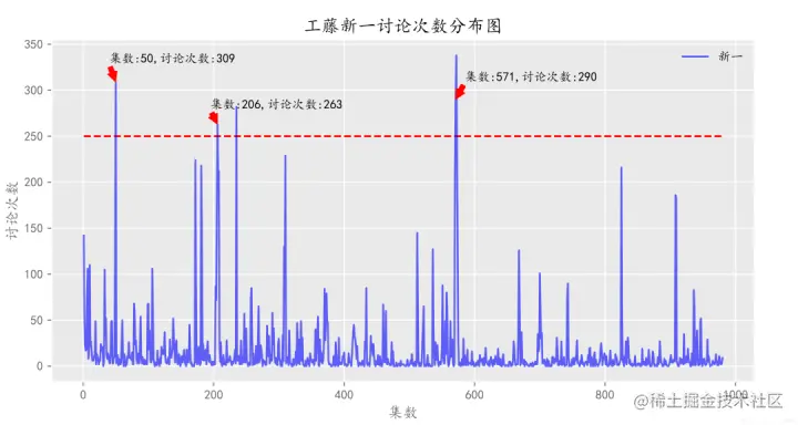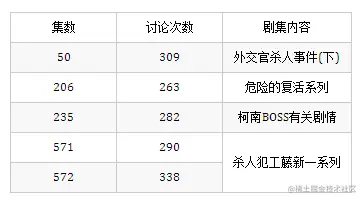 从上图分析可知,组织成员的行动基本一致,其中贝姐(贝尔摩德)的人气在三人中是较高的,特别是在375集(与黑暗组织直面对决系列),讨论次数高达379。此外,统计其讨论次数大于200次的集数,结果如下: