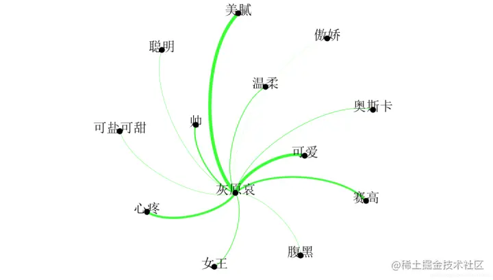 线条越粗的线,代表该人物特征越明显。不难看出,大家对于哀酱的评价主要是美腻、可爱、心疼。