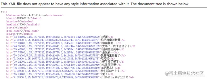 利用Chrome浏览器抓包可知,某站弹幕文件以XML文档式进行储存,如下所示(共三千条实时弹幕)