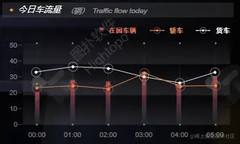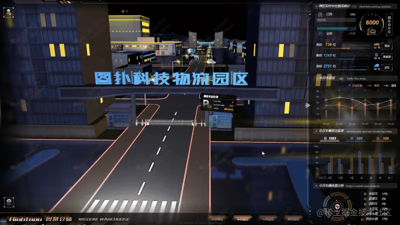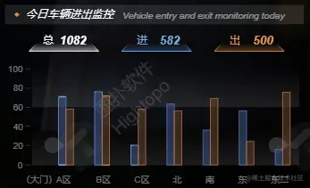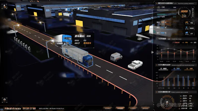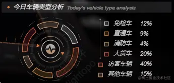 HT 可视化不仅可以处理海量的后台信息并且通过不同的数据可视化样式展示在园车辆、轿车、货车的每日车流量数据。物流车辆在进出配合视频车牌识别系统,可统计车辆进出情况,联动系统高效统计出车辆进出总数量、进出车辆数量,并通过数据可视化形式于面板展示,以及通过监测车辆的进出汇总进出车辆的类型(免检车、直通车、消防车、大货车、访客车辆以及其他车辆)并进行分析统计。
