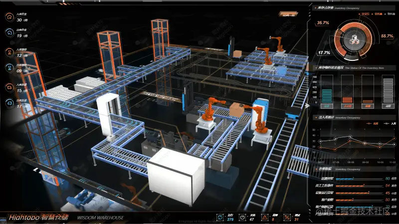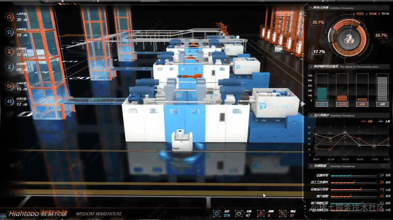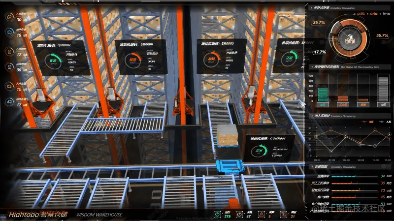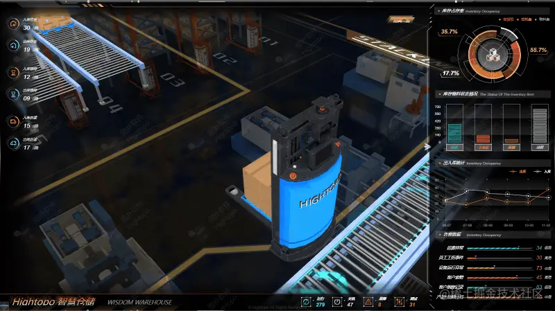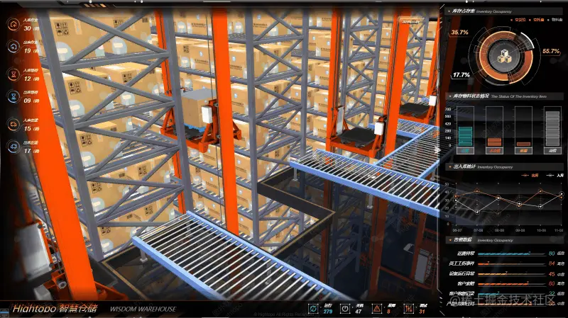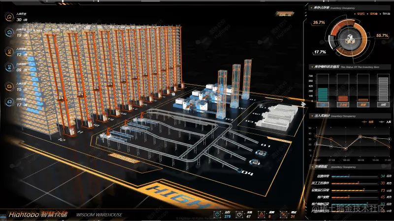 通过依托 HT 可视化技术,智慧仓储管理可以 2D 组态,3D 仿真形态的方式展现出仓储中心与物流转运中心的全场景管理交互系统。智能三维监控系统包含三维可视化立体仓库系统、货位管理、信息实时查询、轨迹实时追踪、设备状态实时追踪、库存管理。