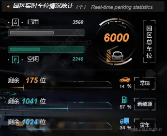 可通过 HT 可视化通过 3D 展示园区内车流情况,系统通过结合地磁方式记录园区内车位情况:园区内总车位数量、空闲与及已使用车位情况、展示常规车辆、新能源、货车等车辆的剩余情况。