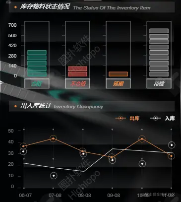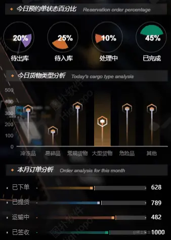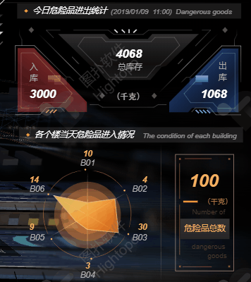 HT 可视化系统从危险品的总库存、出入库数量、各个楼单日危险品进出情况的雷达图分析、今日订单的状态百分比分析、今日货物类型(冷冻品、易碎品、常规货物、大型货物、危险品、其他物品)的柱状图分析以及本月订单情况的分析等不同角度来管理物流信息,以便企业可以及时了解和控制订单的情况,有效地进行产品物流监控与分析跟进,减少问题件的发生情况与查询管理。