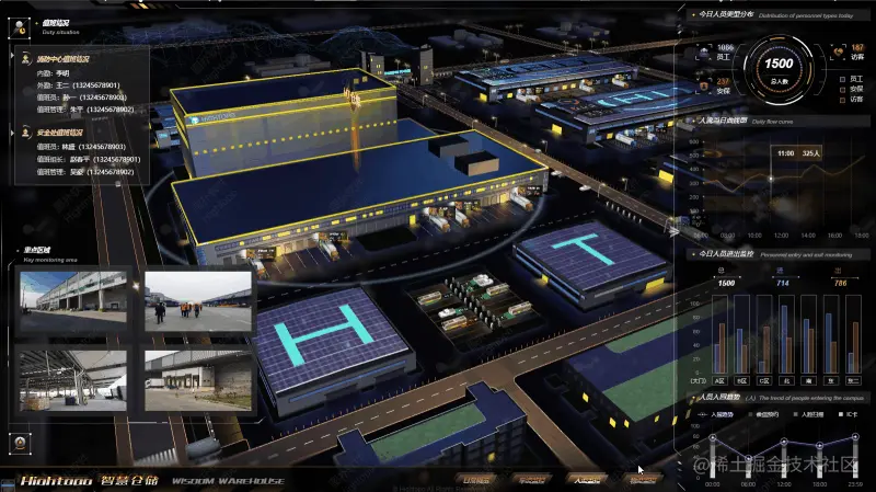 左上方面板体现了今日人员类型的分布(员工、访客、安保等)、通过曲线图实时的变化来展示后台数据接入所体现的当日人流情况以及现阶段人员入园方式(微信预约、人脸扫描、IC 卡)、柱状分析今日人员进出情况。HT 可视化利用丰富的图表、图形和设计元素将相对复杂、抽象的数据通过可视的方式以更直观理解的形式展现,便于园区运维人员的高效管理,无需通过人工核算等复杂形式进行园区的运维分析。