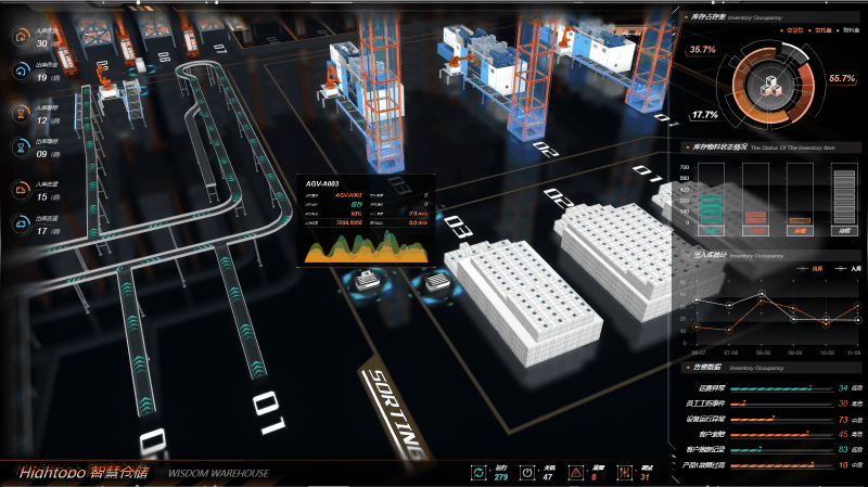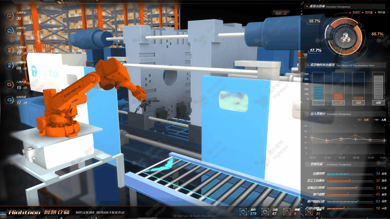 物料流程监控通过 HT 3D 效果将物料从入库开始到出库完成的全过程信息监控,并对立体库货架、堆垛机、输送机、拆叠盘机、RGV(直行穿梭车)、AGV(自动导引运输车)、堆垛机、机械臂等设备状态进行信息监控,数字孪生智慧仓储物流一体化场景。使物流全过程数字可视化展现、可自动感知识别、可追踪溯缘、可实施应对、可智能化决策、各环节信息系统交互集成。