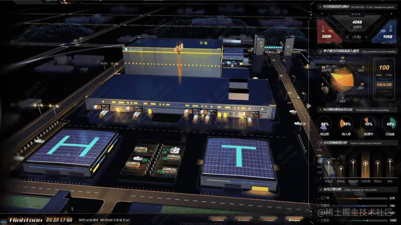 HT 支持多种方式的模型渲染,采用轻量化三维建模技术, 1:1 高仿真模拟,以三维场景为基础,2D 数据面板为辅,数字化展现物流园区各区域的建设、运行情况、安全配备、周边动态环境等情况。同样支持导入 IFC 格式的 BIM 模型文件生成场景,支持渲染 3D Tiles 格式的倾斜摄影模型文件。通过 HT 实现可交互式的 Web 三维场景,可进行缩放、平移、旋转,场景内各设备可以响应交互事件。