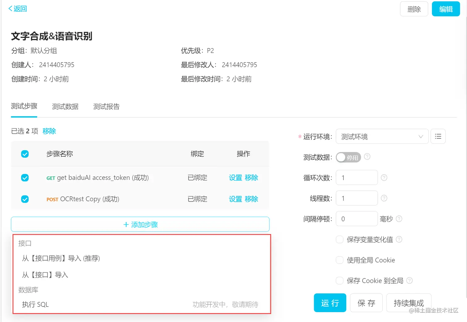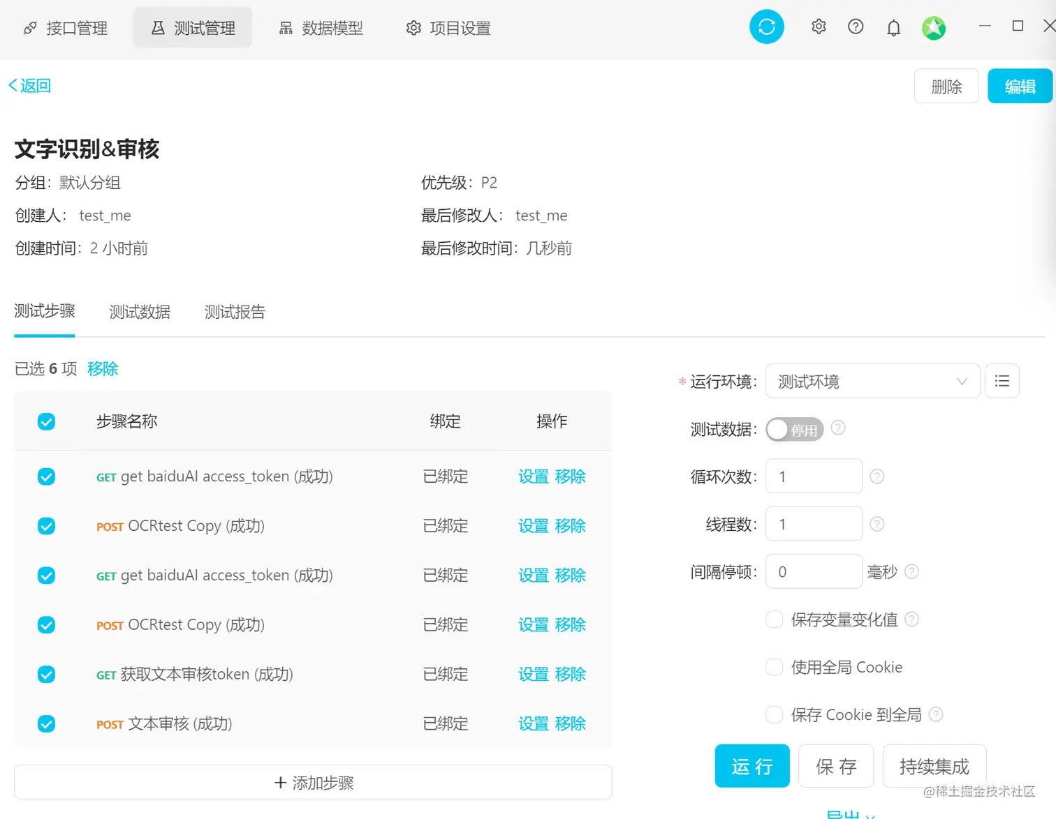 如图所示,我已经将OCRtest(文本识别接口,功能为识别图片上的文字)接口导入用例步骤中,启用了外部测试数据,