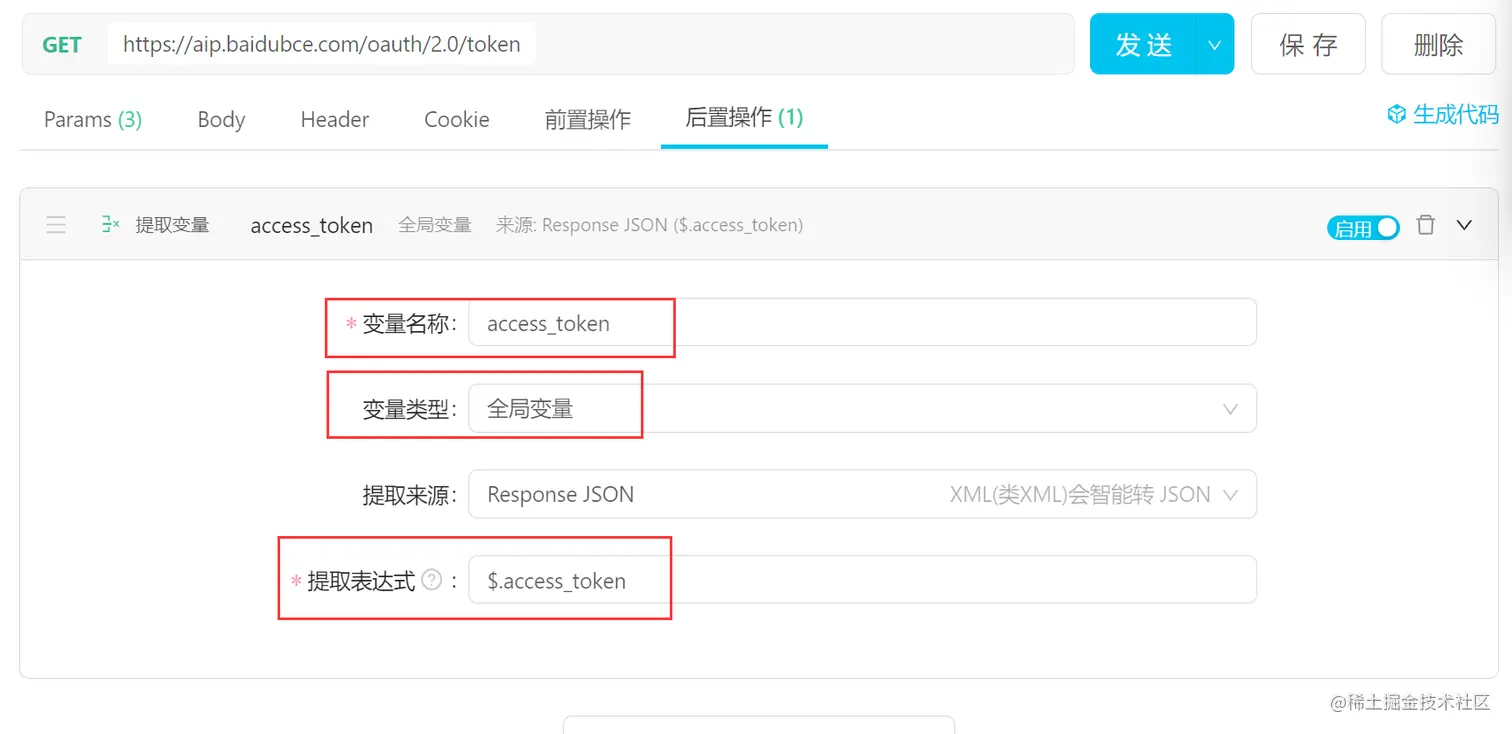 1)在apifox的接口tab-后置操作tab,选择提取变量