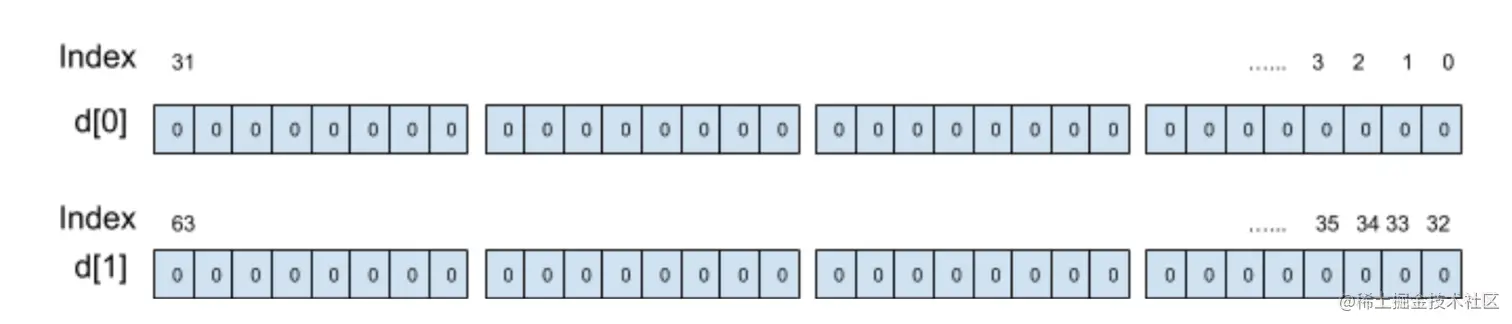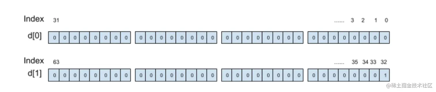 这个位数组总共可以表达 64 个状态位,通过上图,我们可以得知,位数组在内存中的结构以及这个位数组索引的分布。