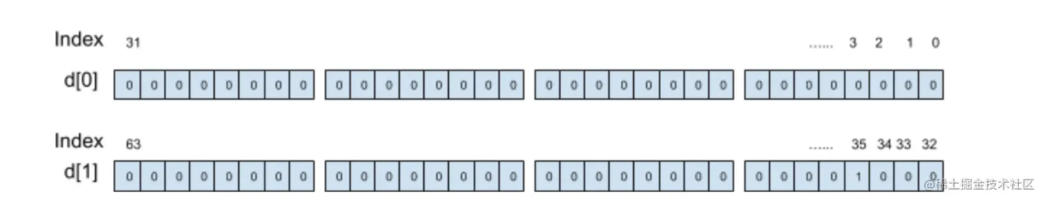 所在数组中的元素为: 35 / 32 = 1 比特位在元素中的位置为:35 % 32 = 3