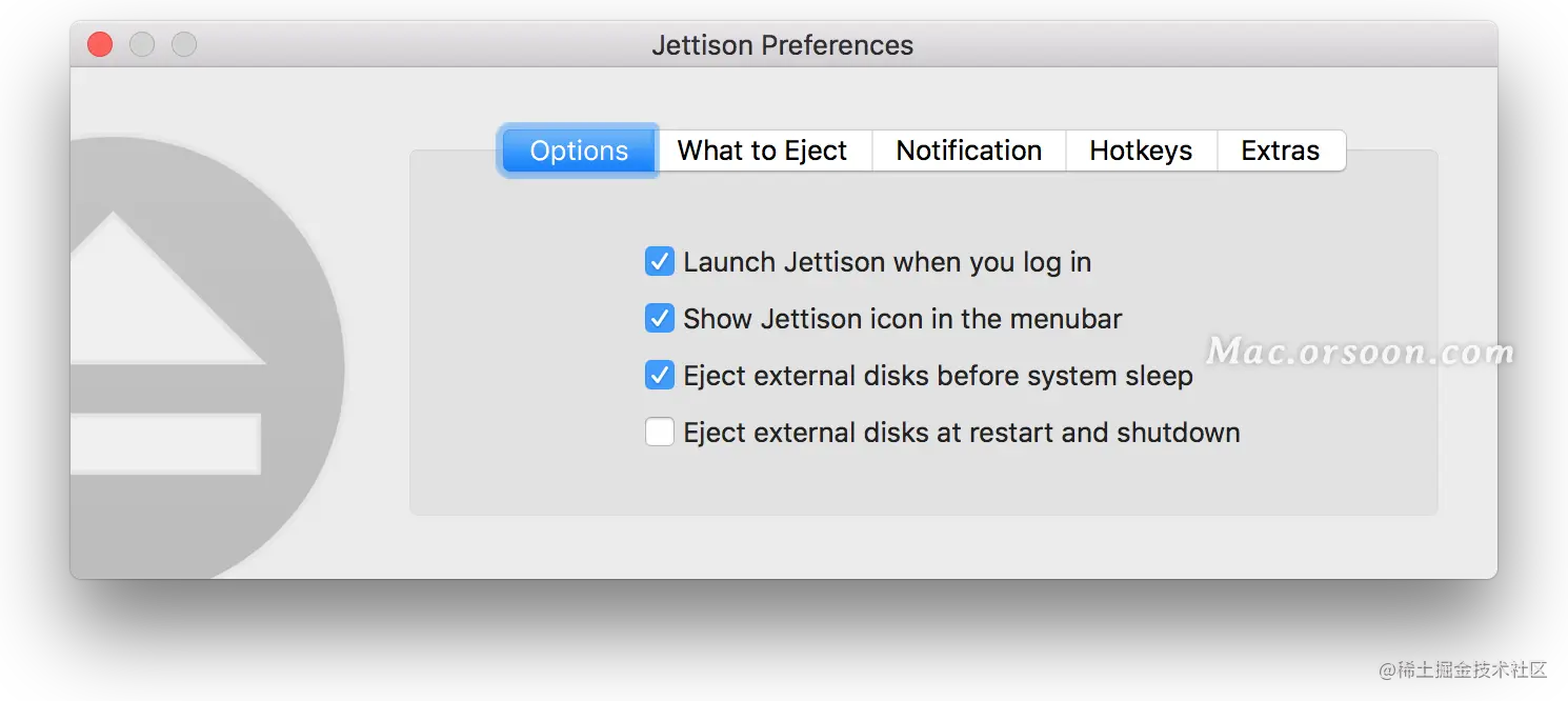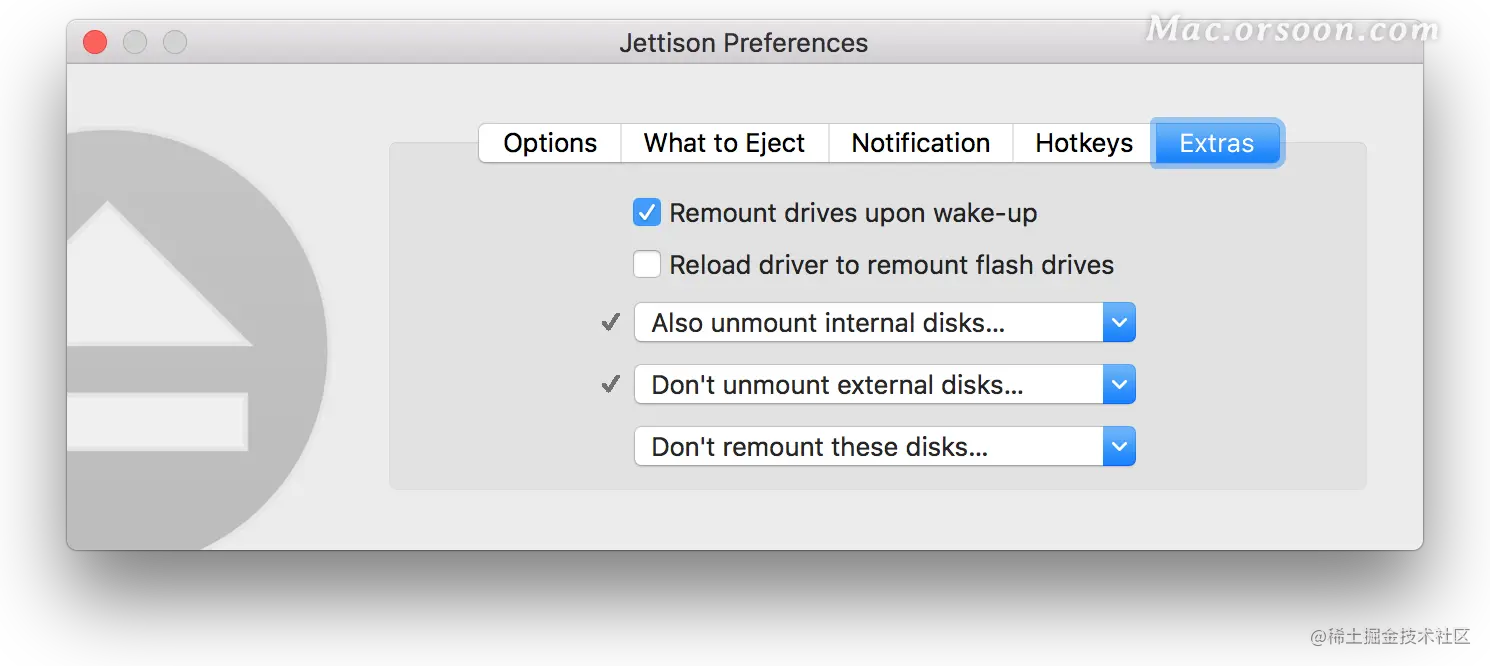 Jettison for Mac是Mac os平台上的一款非常不错的辅助工具,Jettison for mac是一款能自动弹出Mac外部磁盘的实用小工具。 Jettison Mac 破解版能简化推出外部磁盘的流程,在您急着出门或者Mac即将进入休眠模式的时候,迅速唤醒,自动弹出备份的驱动器。