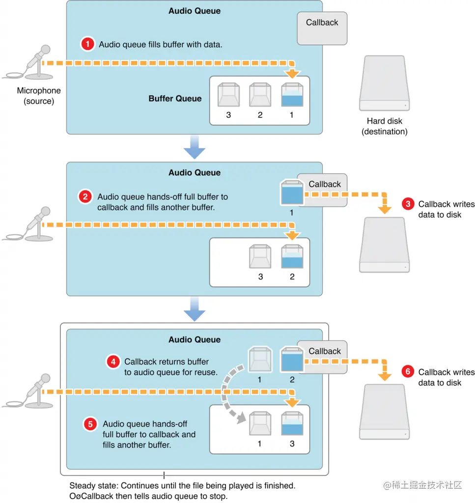 音频队列可以使用任意数量的缓冲区。你的应用程序自定义它的数量。一般情况下是3个。这样就可以让给一个忙于将数据写入磁盘,同时另一个在填充新的音频数据,第三个缓冲区在需要做磁盘I/O延迟补偿的时候可用。