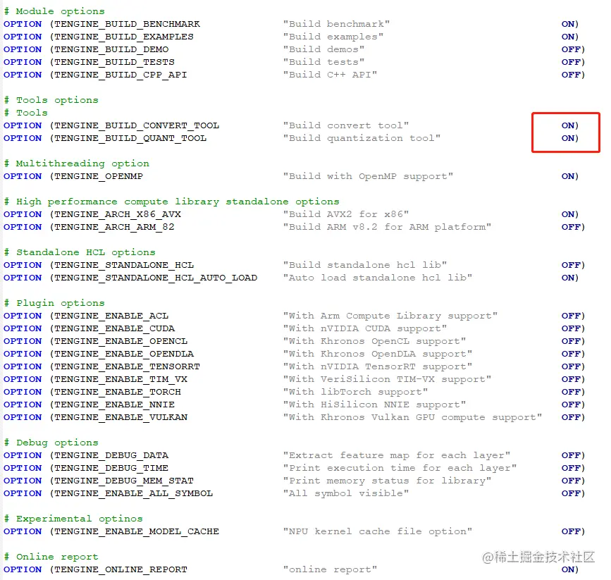 看一下其实刚拿到手的 CmakeList.txt 里有挺多模块的构建都是默认关闭的,如果你想编译某些模块,可以把对应的开关打开,就像我这里打开了 CONVERT_TOOL、QUANT_TOOL 模块一样,如下: