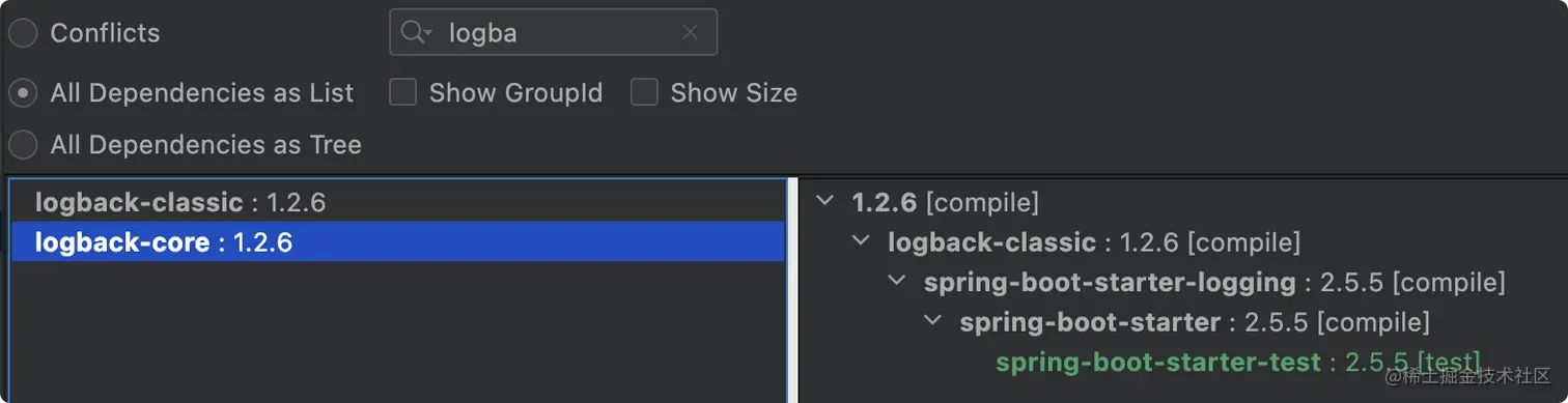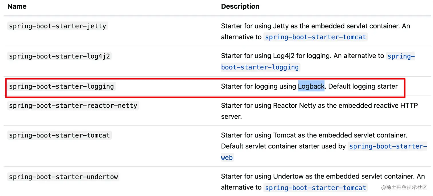 如图,如果我们没有指定任何其他日志 Starter,默认的就是 Logback。