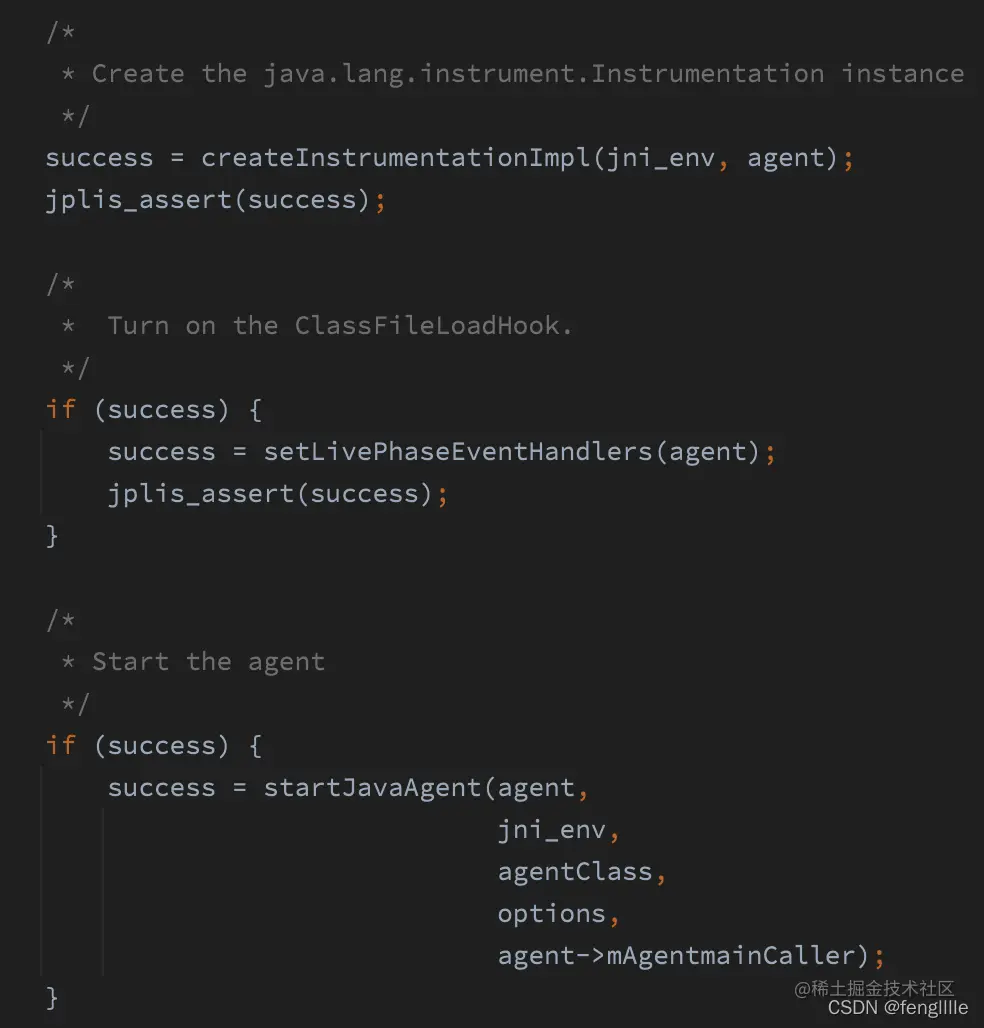 3. 启动agent,实际上是调用第一步创建InstrumentationImpl实例的loadClassAndCallAgentmain方法
