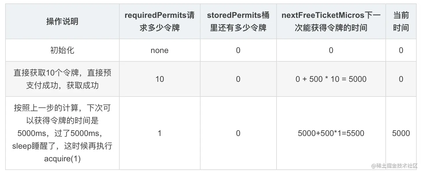 returnValue=5500, storedPermitsToSpend=0,freshPermits=10,需要预支付10个令牌, waitMicros=10 * 500ms = 5000,然后nextFreeTicketMicros更新为5500+5000=10500,返回returnValue=5500;外层函数睡眠5500-5000=500ms,返回500(输出打印获取10个token,约0.5s)