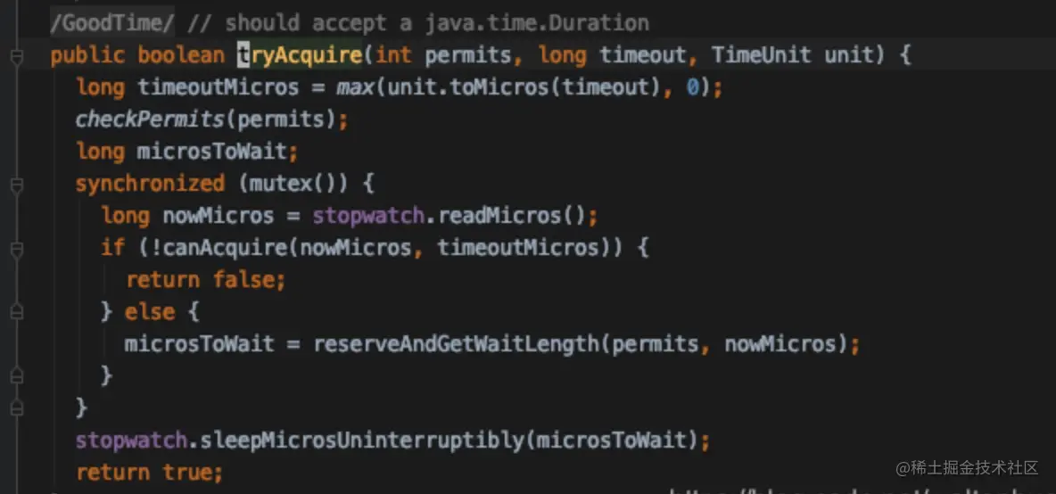 tryAcquire(long timeout, TimeUnit unit):从RateLimiter 获取许可如果该许可可以在不超过timeout的时间内获取得到的话,或者如果无法在timeout 过期之前获取得到许可的话,那么立即返回false(无需等待)