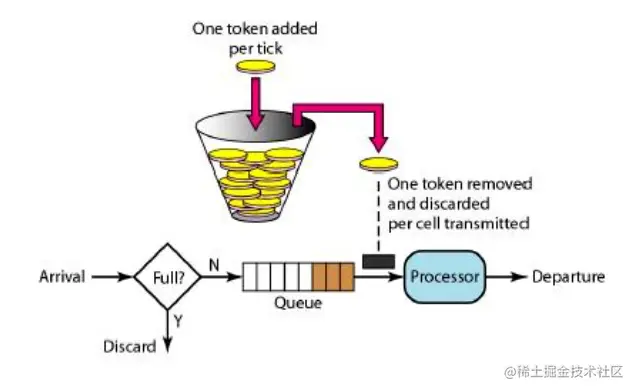 令牌听起来挺酷的。以固定的速率往桶里发放令牌。然后消费者每次要取到令牌(acquire)才可以响应请求。