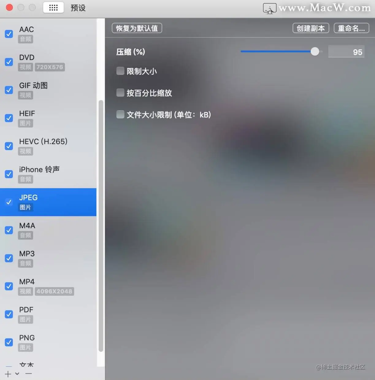 Permute提供了很多预设格式,你可以在应用的偏好设置中,调节这些参数,比如设备、压缩比、质量级别等。