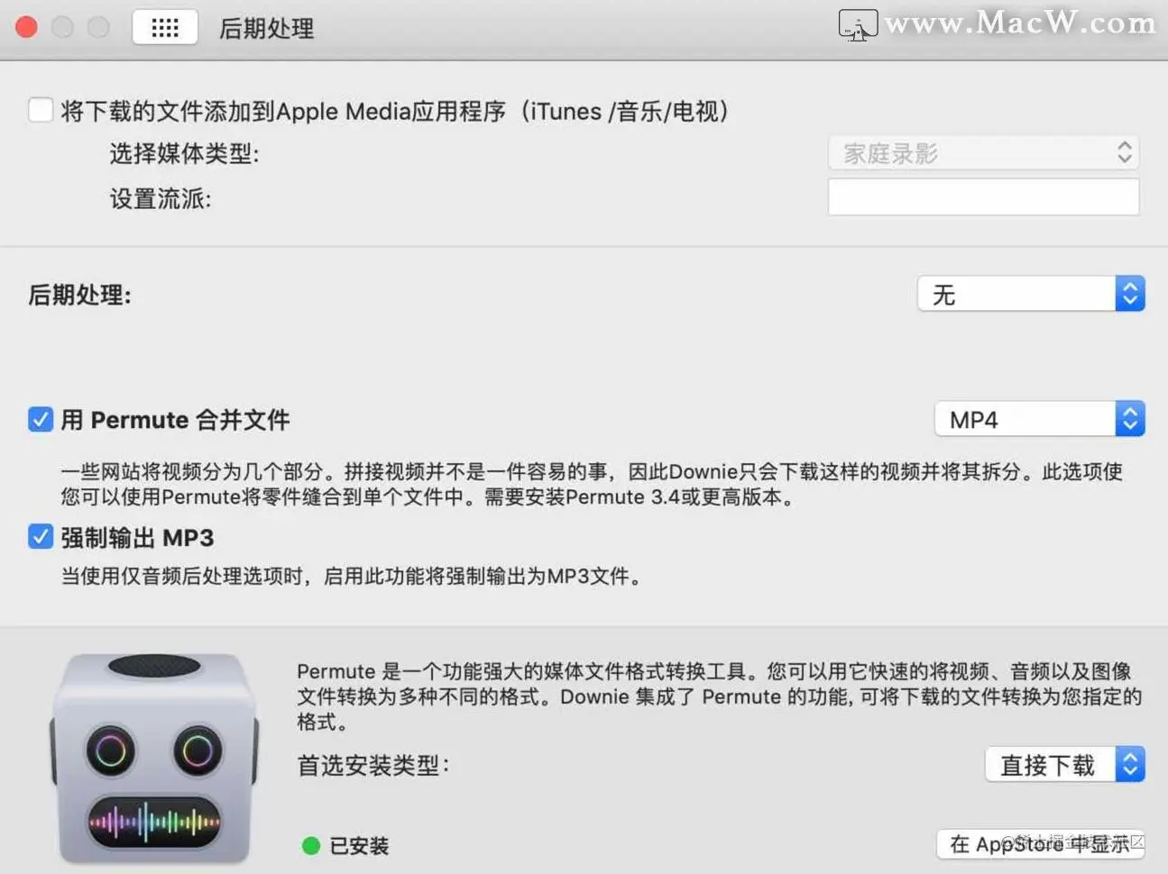 二者有一个挺棒的”小合作”,就是Permute可以将Downie下载的分段视频合并为一个长视频,且支持转换格式,这个流程是无缝的,只需要在Downie设置中打开这个开关。