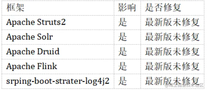 截止目前,第三方框架中使⽤Apache Log4j2的,⽐如srping-boot、Apache Struts2等,暂未发布最新修复版本。
