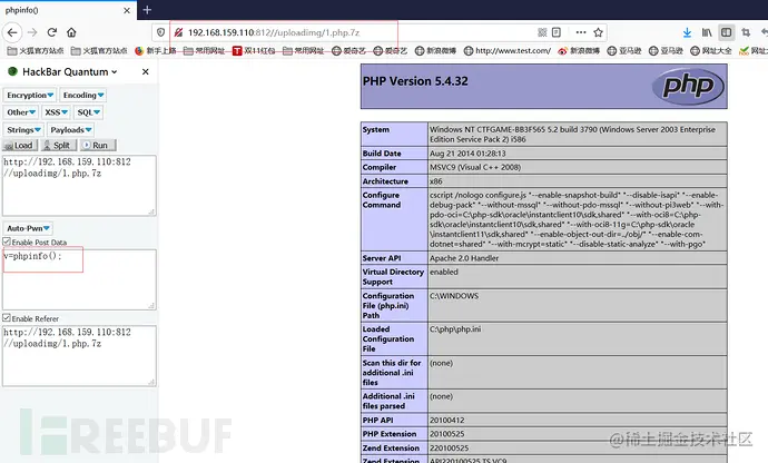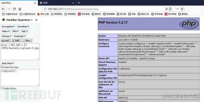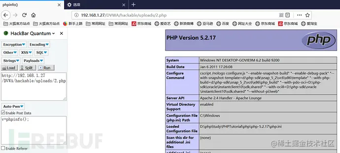 用hackbar工具定义参数v=phoinfo();查看php状态信息