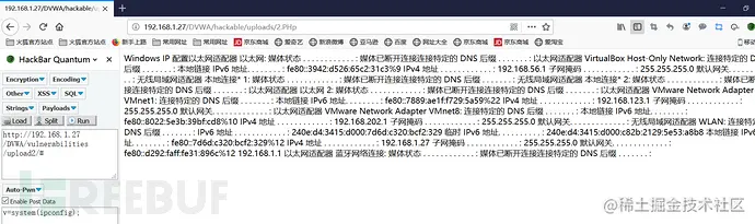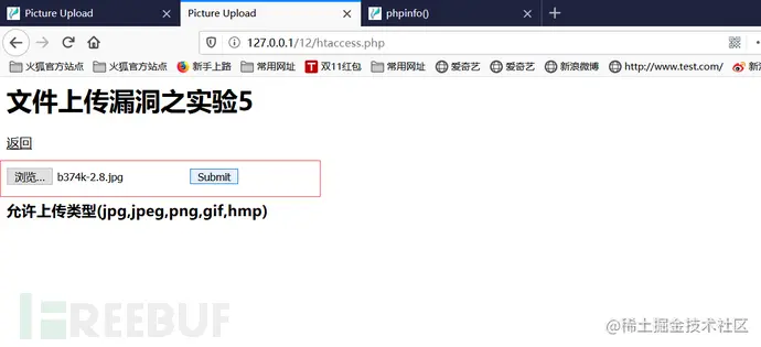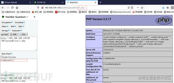 用hackbar工具定义参数v=phoinfo();查看php状态信息 (五)该网页只允许上传图片,修改后缀名无效