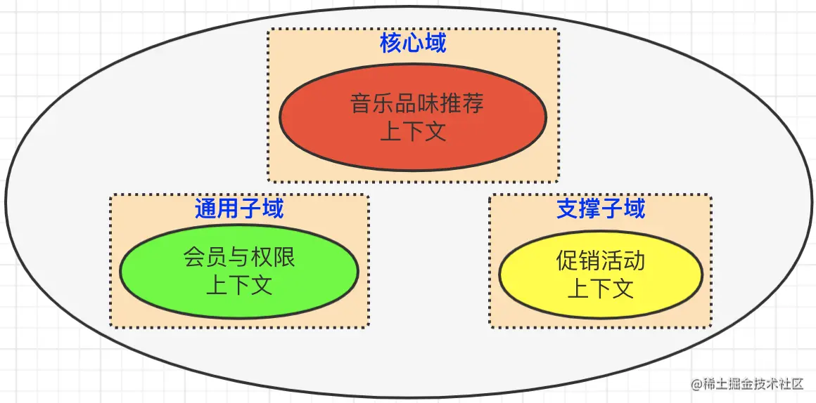 子域根据类型的不同,可分为:核心域、支撑子域和通用子域。以一个音乐网站或者app为例(排除掉版权问题,假设所有数字音乐各大音乐网站都可以平等播放),它一般包含很多的功能,我们暂且只关注音乐品味推荐、会员与权限、促销活动这3部分功能,那么如下就是针对这3部分子域类型的划分: