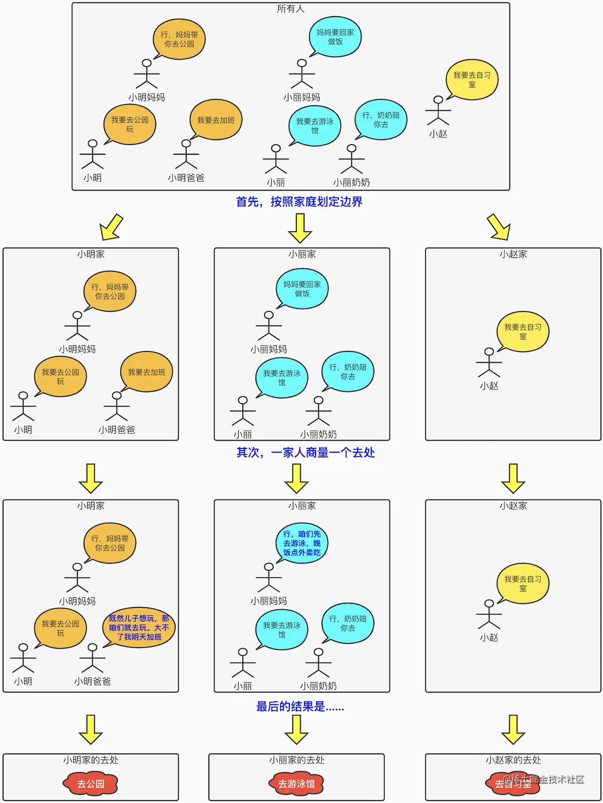 那怎么办呢?大家谁都不让步。分析原因,广场上的这群人,彼此之间又都是陌生的,那么陌生人也不会轻易的迁就对方,那么我们以家庭进行分组(建立边界),由一家人(即:在同一限界上下文中)内部去商量要去哪里,确定一致性建议。