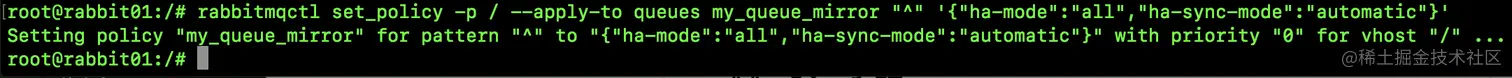 rabbitmqctl set_policy -p / --apply-to queues my_queue_mirror "^" '{"ha-mode":"all","ha-sync-mode":"automatic"}'