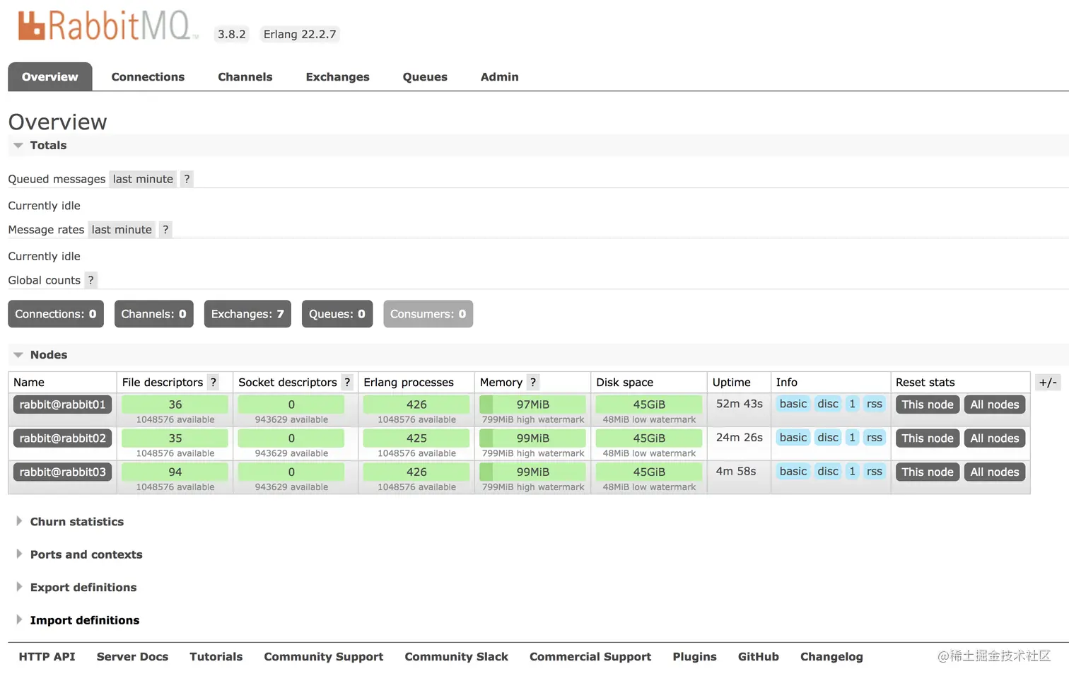 这条消息发送成功之后,在 RabbitMQ 的 Web 管理端,我们会看到三个 RabbitMQ 实例上都会显示有一条消息,但是实际上消息本身只存在于一个 RabbitMQ 实例。
