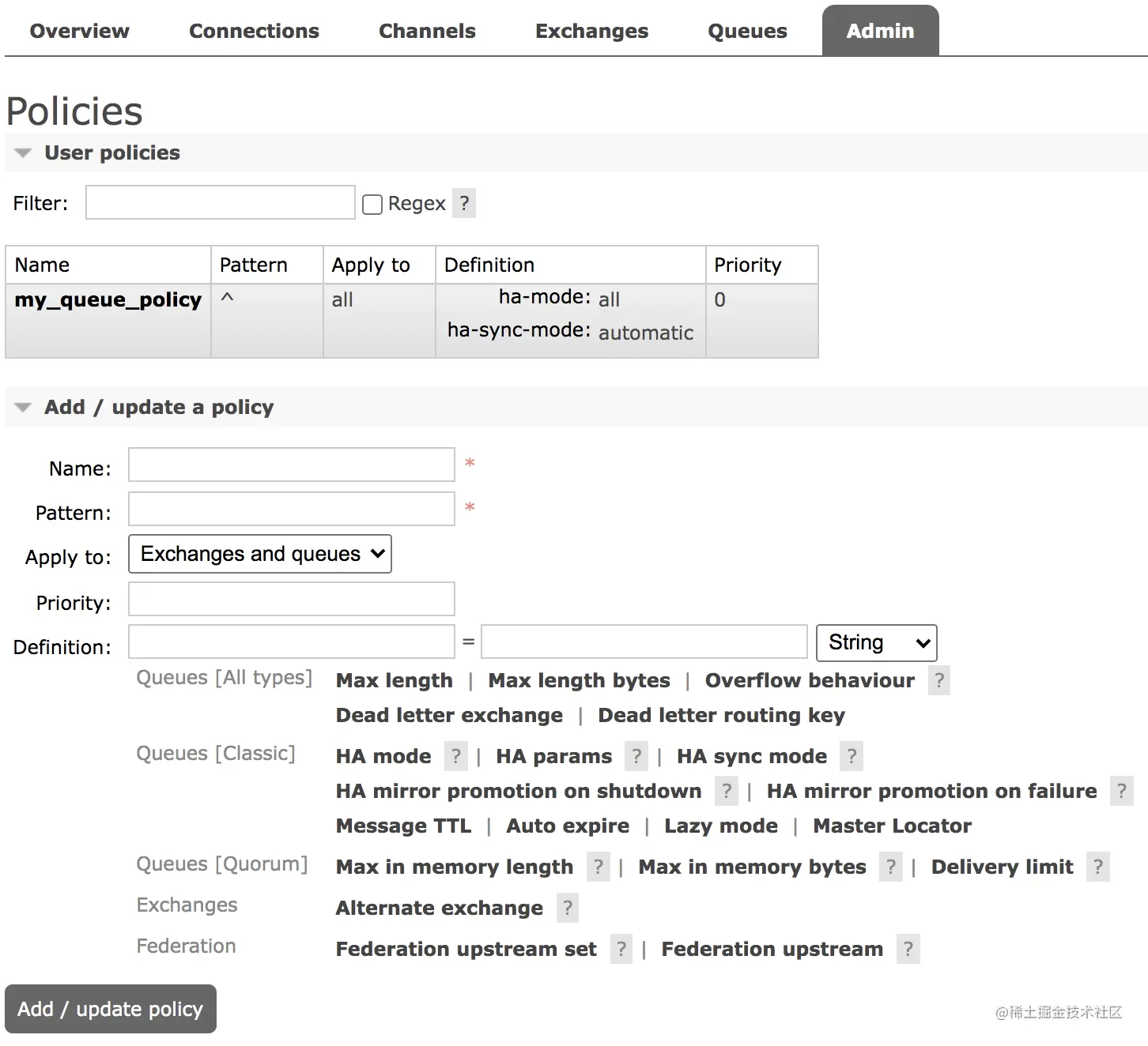 - Definition:镜像定义,主要有三个参数:ha-mode, ha-params, ha-sync-mode。