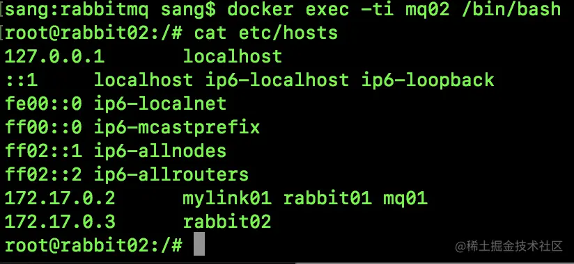 接下来进入到 mq02 容器中,首先查看一下 hosts 文件,可以看到我们配置的容器连接已经生效了: