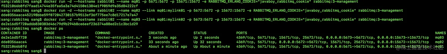 三个节点现在就启动好了,注意在 mq02 和 mq03 中,分别使用了 --link 参数来实现容器连接,关于这个参数,如果大家不懂,可以在公众号江南一点雨后台回复 docker,由松哥写的 docker 入门教程,里边有讲这个。这里我就不啰嗦了。另外还需要注意,mq03 容器中要既能够连接 mq01 也能够连接 mq02。