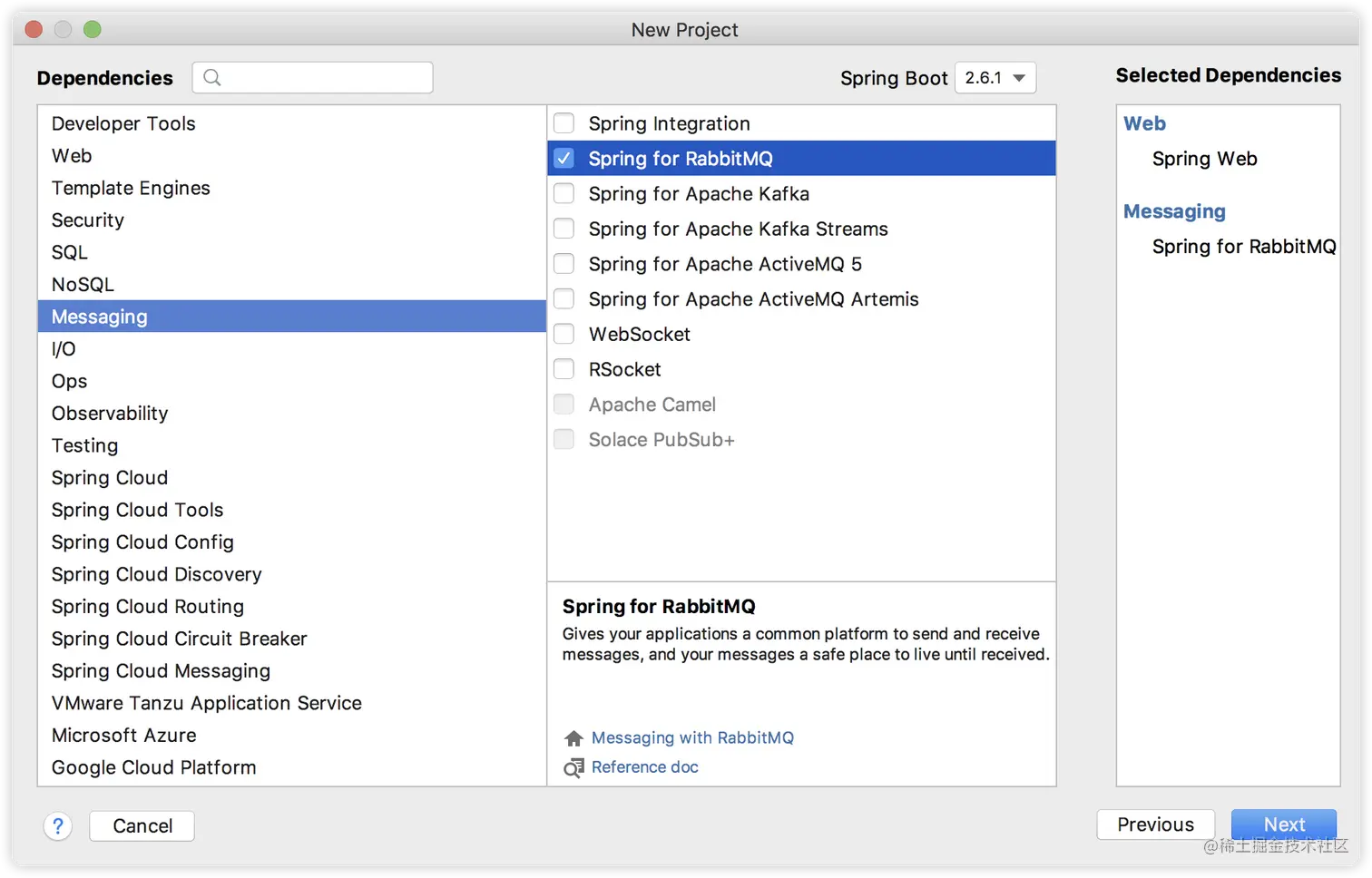 第一个子工程名为 provider,是一个消息生产者,创建时引入 Web 和 RabbitMQ 依赖,如下: