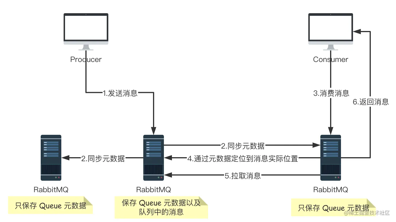 当我们消费消息的时候,如果连接到了另外一个实例,那么那个实例会通过元数据定位到 Queue 所在的位置,然后访问 Queue 所在的实例,拉取数据过来发送给消费者。