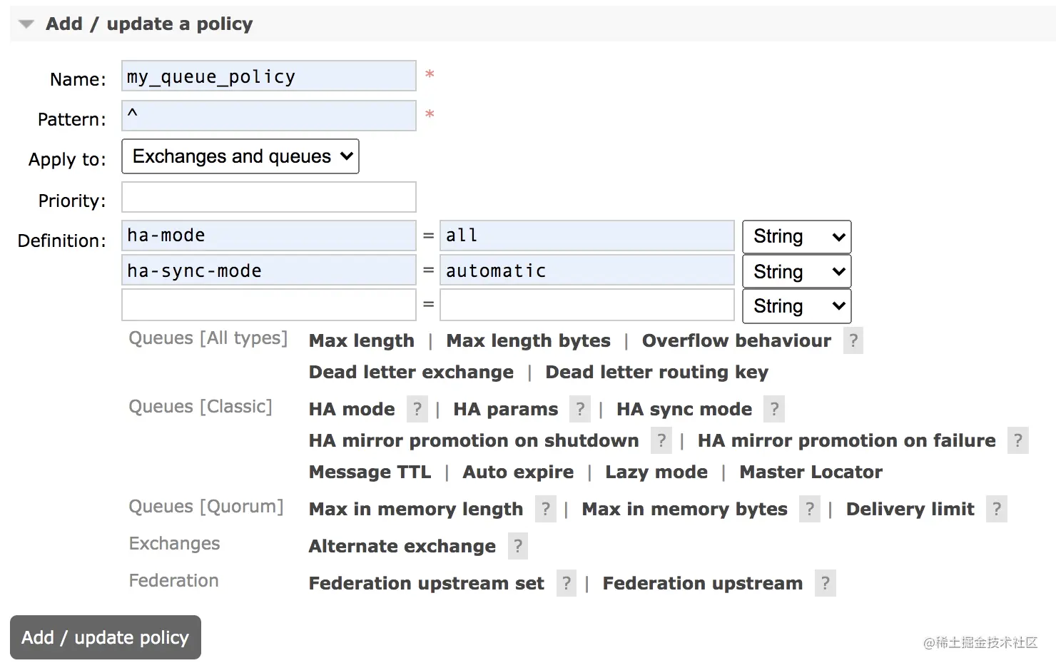 - ha-sync-mode:进行队列中消息的同步方式,有效值为 automatic 和 manual。