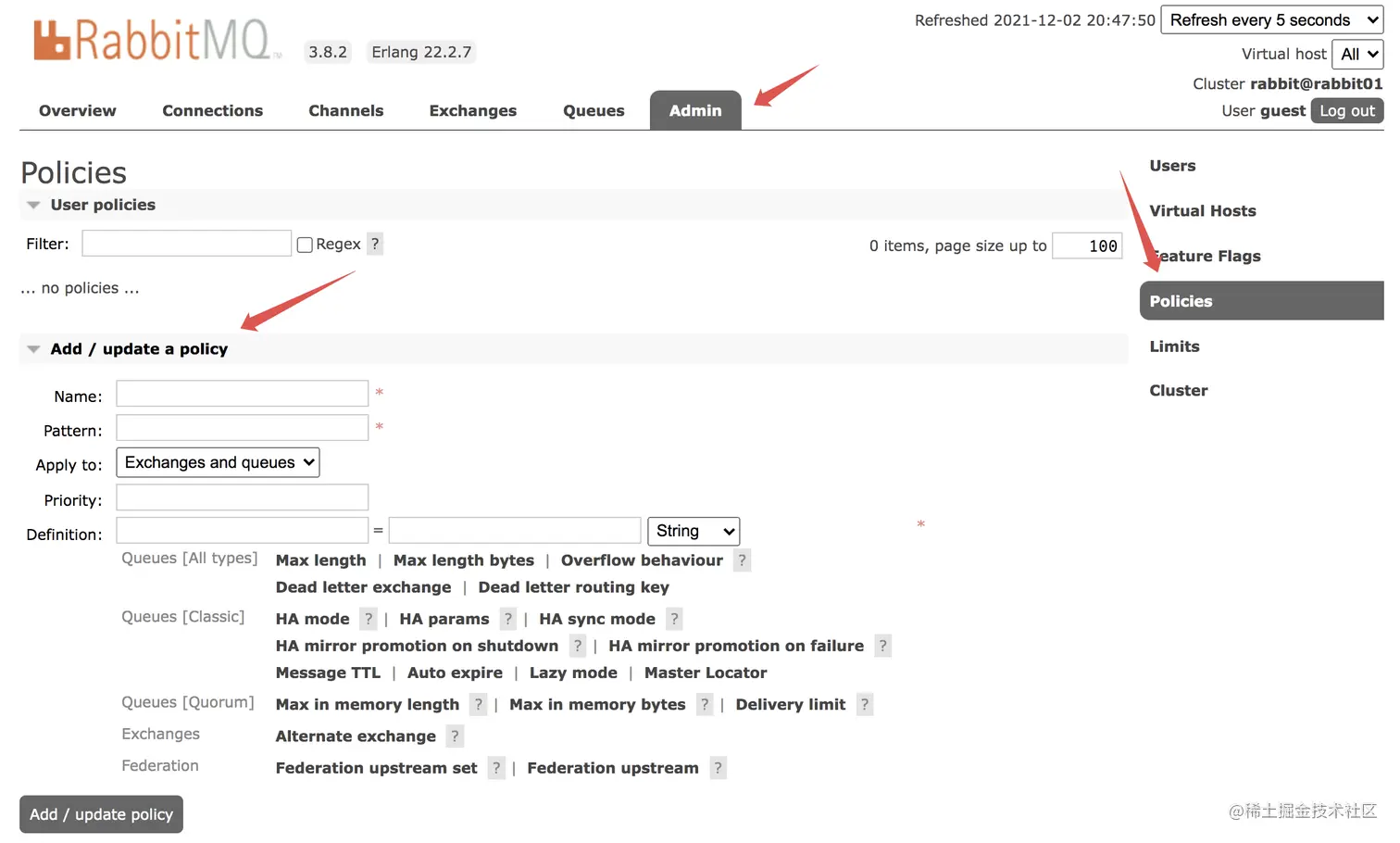 点击 Admin 选项卡,然后点击右边的 Policies,再点击 Add/update a policy,如下图:
