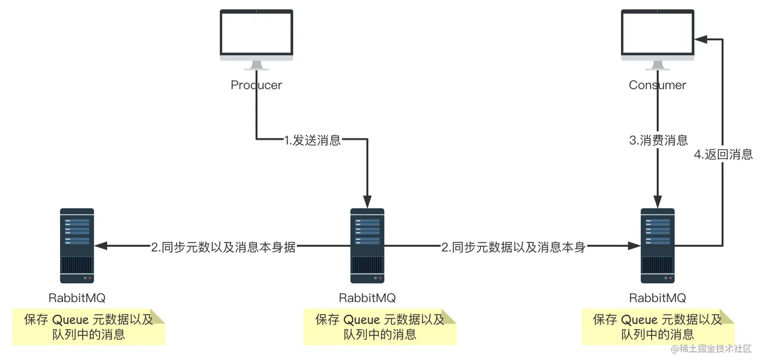 它和普通集群最大的区别在于 Queue 数据和原数据不再是单独存储在一台机器上,而是同时存储在多台机器上。也就是说每个 RabbitMQ 实例都有一份镜像数据(副本数据)。每次写入消息的时候都会自动把数据同步到多台实例上去,这样一旦其中一台机器发生故障,其他机器还有一份副本数据可以继续提供服务,也就实现了高可用。