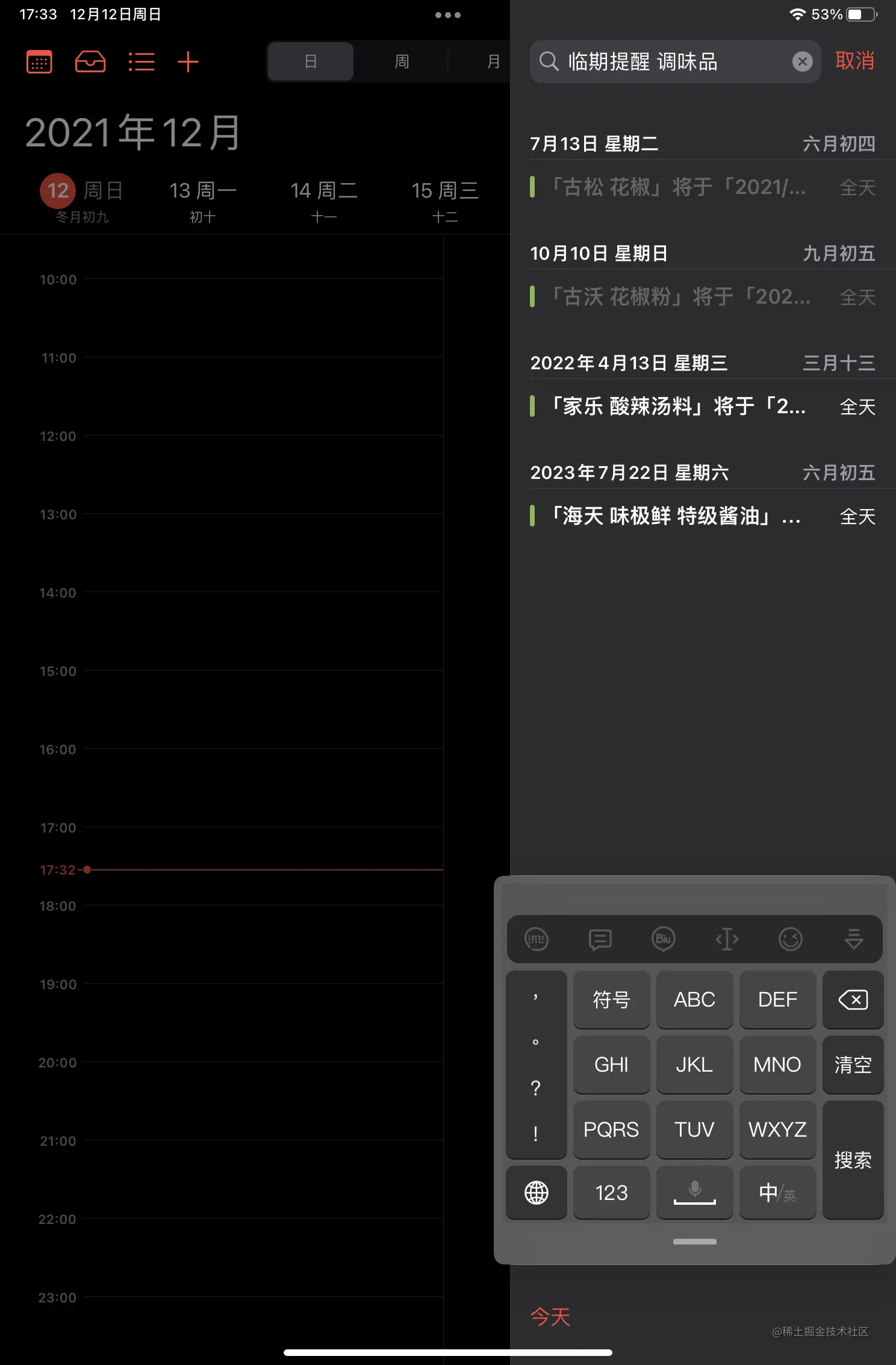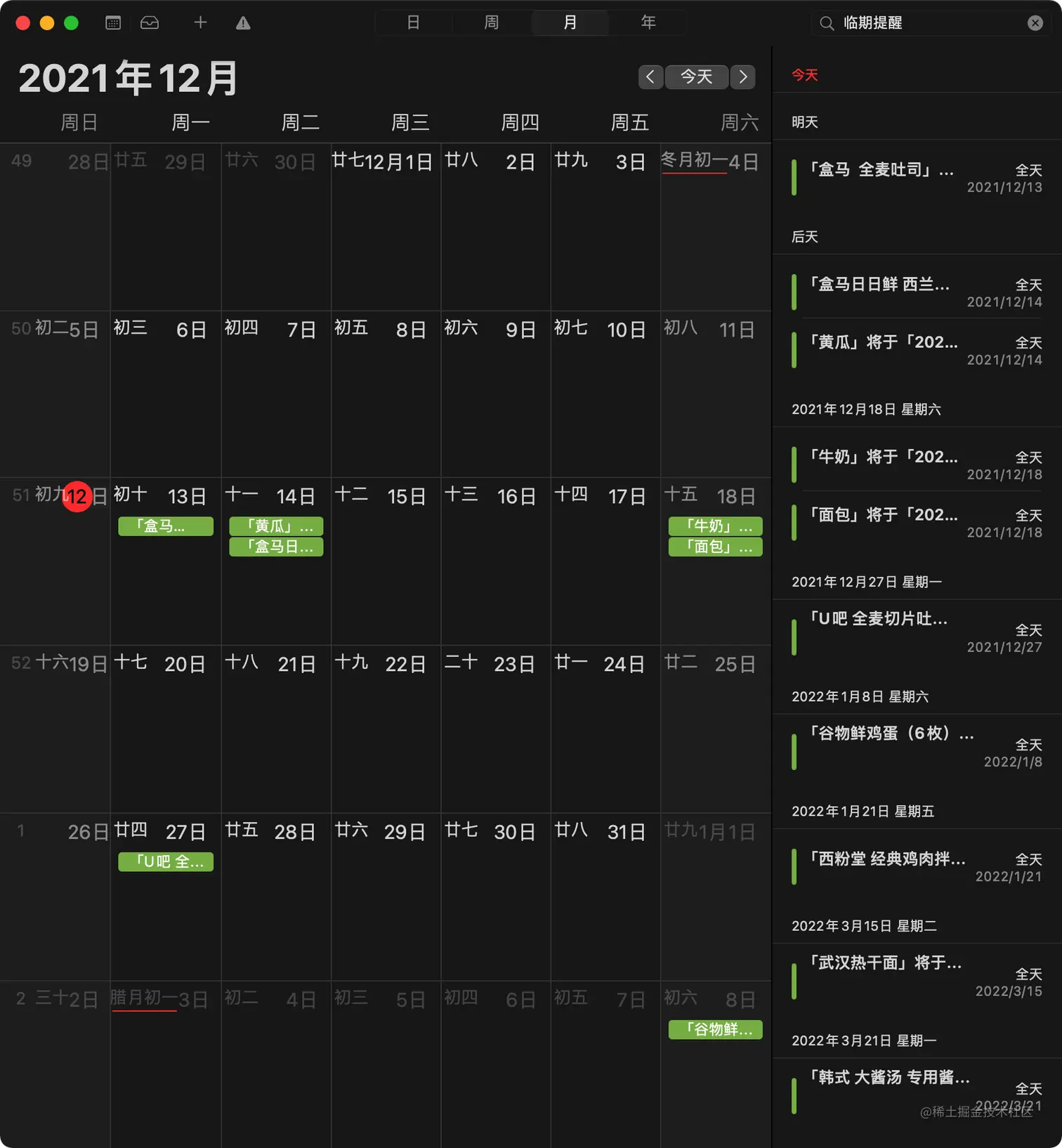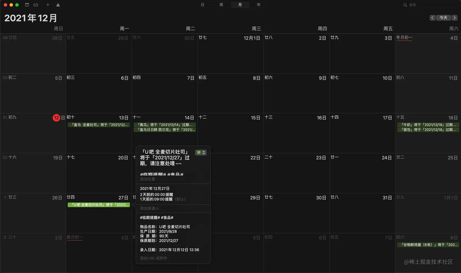 - 可以在 iPhone、iPad、Mac 的「日历」中 很方便的查看 已录入的临期提醒