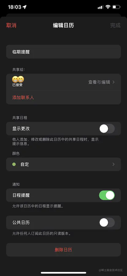开发完「临期提醒」的捷径,马上分享给了室友,并与他共享了该日历,