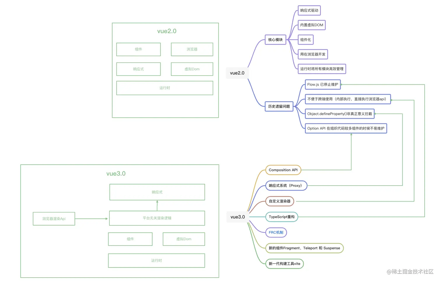本文会从vue2.0的主要模块及遗留问题开始,继而3.0有哪些新特性进行描述,画了一个粗略的简图: