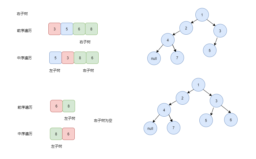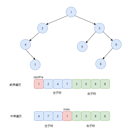 我们看上面的图片,首先数据保证了正确性,那么前序的第一个肯定是root节点,也就是1,那么我们需要在中序遍历中找到1的位置,左边就是这个root的左子树,右边就是root的右子树。
