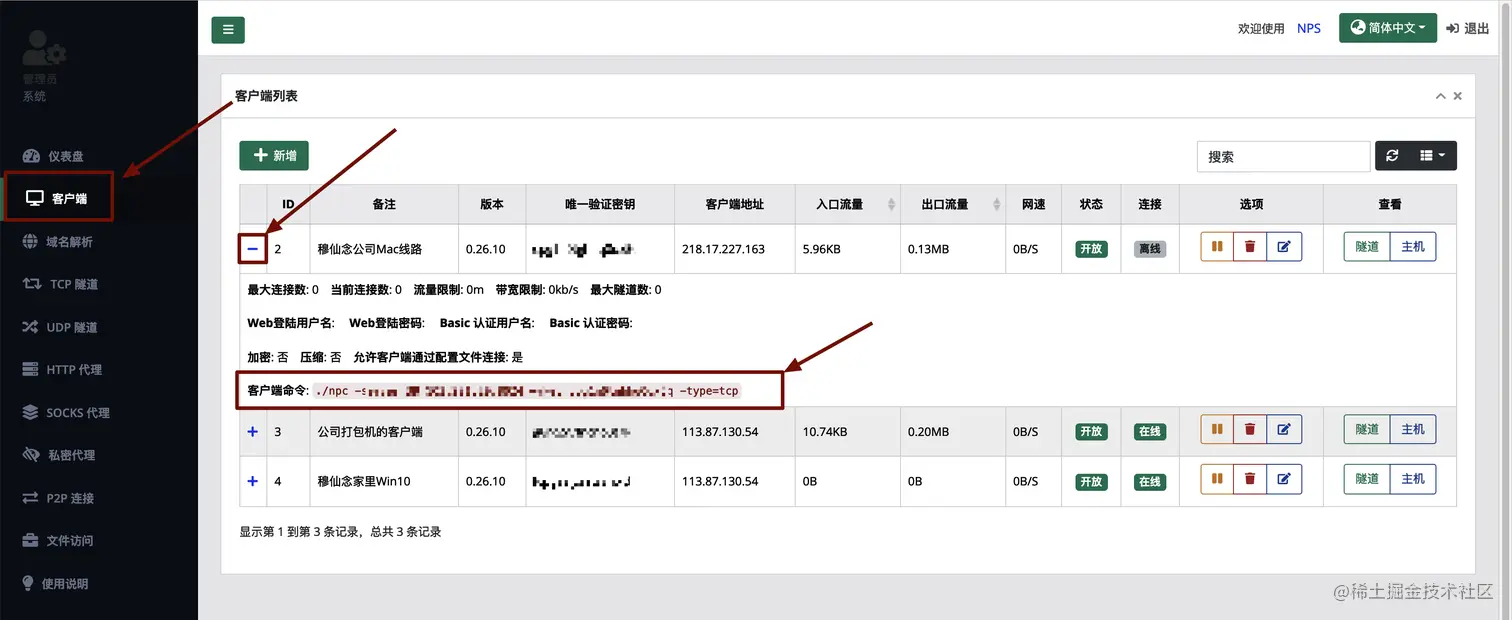 进入客户端列表,点击你需要使用的客户端左边的+号,在展开的信息中复制客户端命令